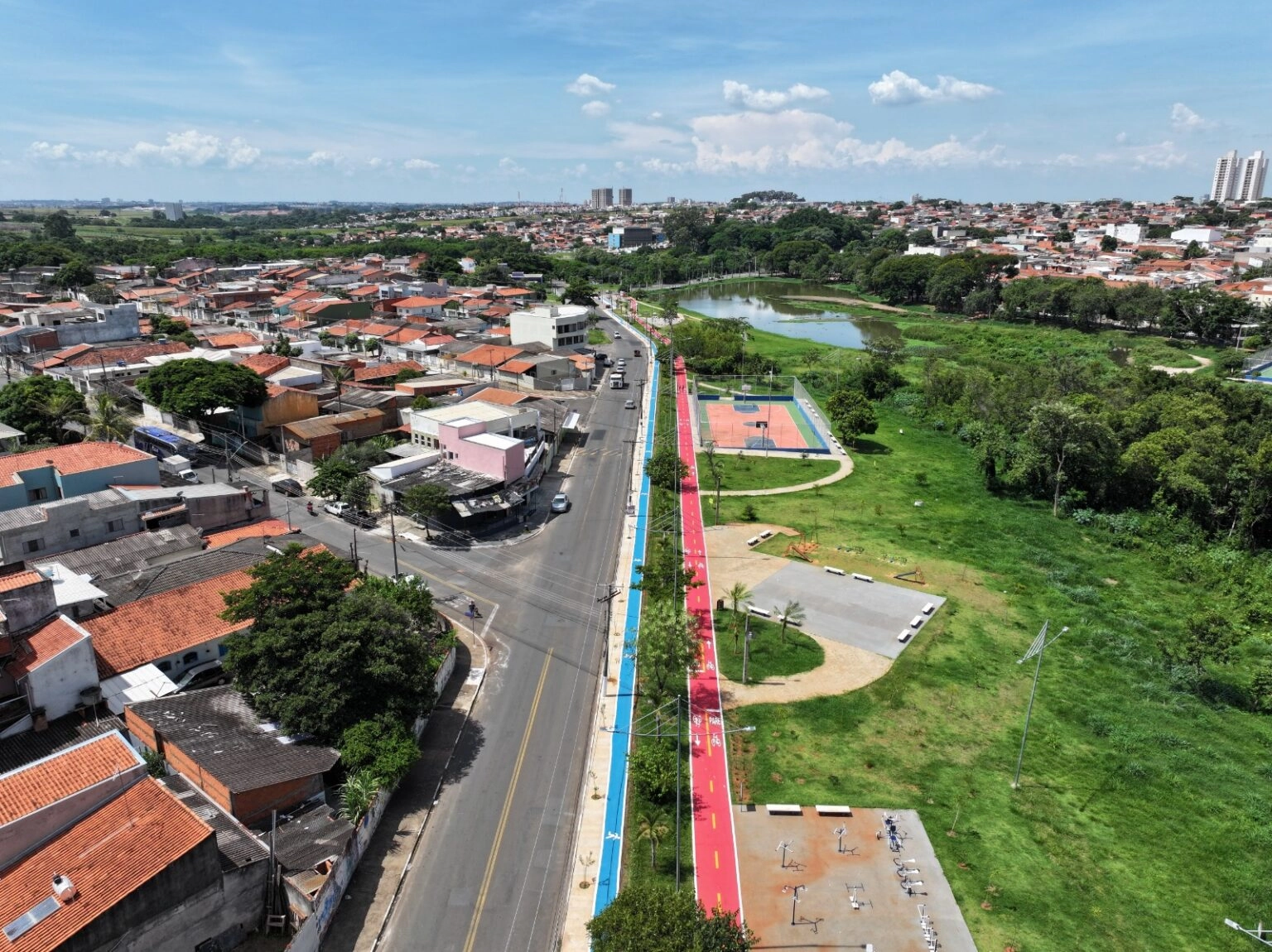O parque socioambiental do Jardim Amanda, que teve a primeira etapa das obras concluídas e inaugurada pela Prefeitura de Hortolândia em dezembro do ano passado, recebe a implantação de novos dispositivos que contribuem com o lazer da população que já frequenta a área. De acordo com a Secretaria de Mobilidade Urbana foi concluída, nesta sexta-feira (20/02), a pintura de aproximadamente 1,6 km de pistas de ciclovia e caminhada. A ciclovia possui a manta na cor vermelha e o trecho da calçada que acompanha a ciclovia recebeu a pintura na cor azul. Além disso, também foi realizada a pintura de pictogramas de segurança, faixas de pedestres e a instalação de placas.