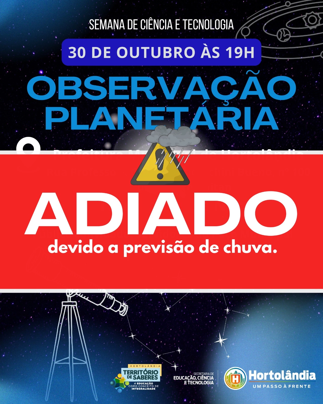 A Prefeitura de Hortolândia adiou a Observação Planetária, que aconteceria nesta quinta-feira (30/10), no Terraço da Ala Norte da Prefeitura, localizada na Rua Professora Celina Franceschini Bueno, nº 100, Jardim Metropolitan. A medida foi necessária, em razão da previsão de chuva para o horário da atividade, que integra a III Semana Municipal de Ciência e Tecnologia.